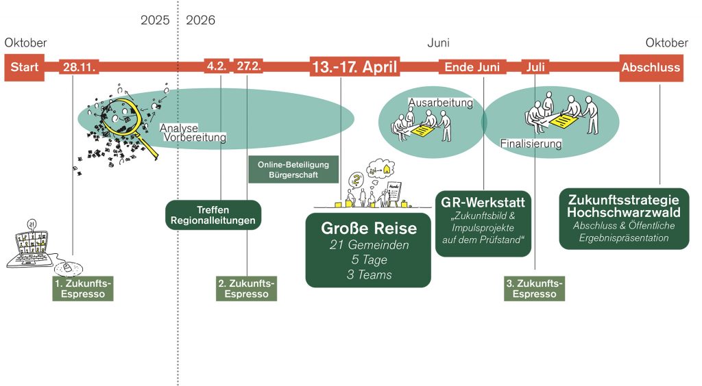 Mit dem Zukunftsprozess Hochschwarzwald entwickeln die 21 Gemeinden der Region ein gemeinsames Zukunftsverständnis und eine verbindende Strategie für eine starke, lebenswerte und attraktive Region. Im Mittelpunkt stehen dabei nicht einzelne Maßnahmen, sondern die Qualität der Orte selbst: gute Orte, in denen sich Menschen wohlfühlen – Einheimische wie Gäste. Der Zukunftsprozess wird begleitet durch das Büro nonconform.